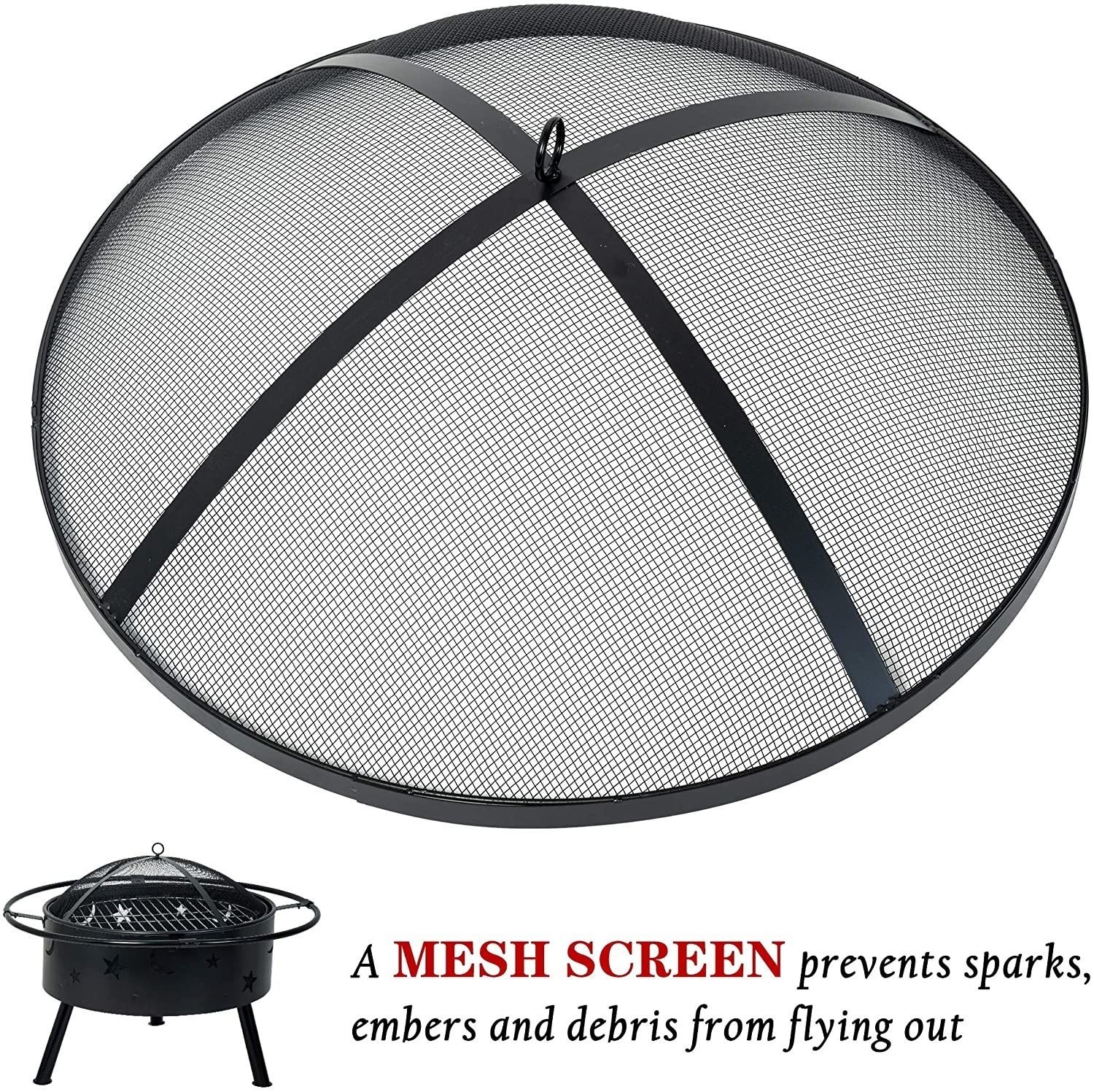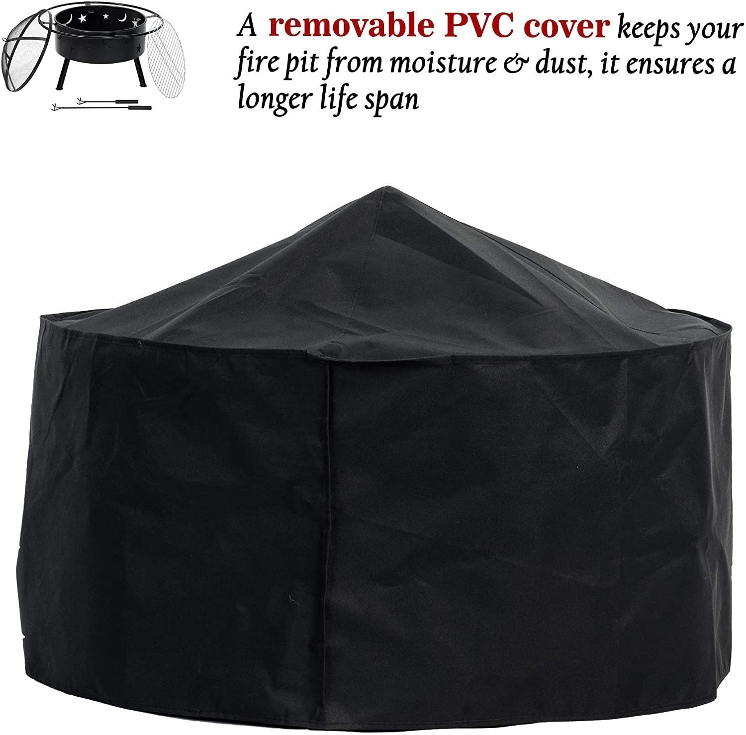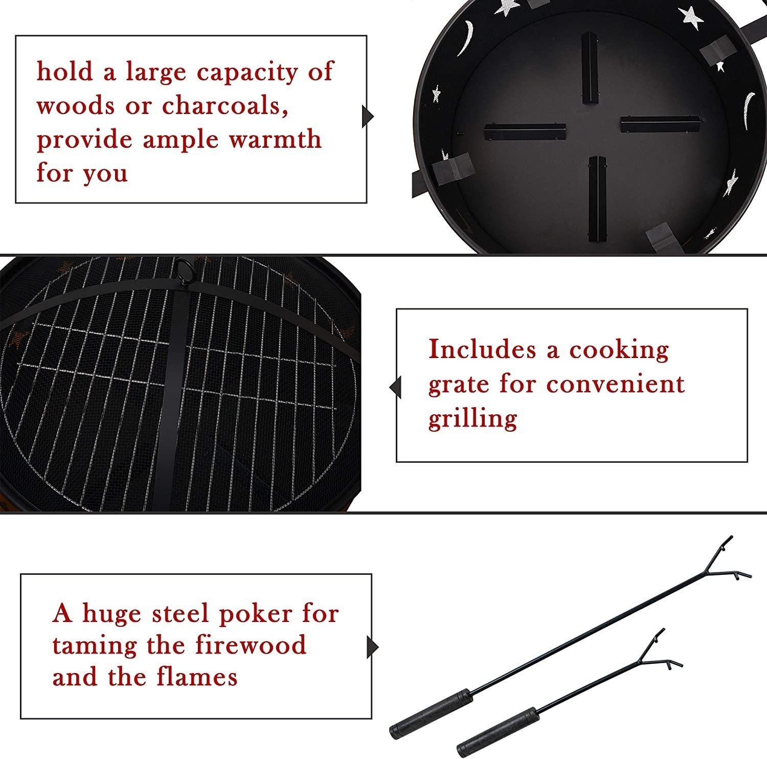 3.[THOUGHTFUL DESIGN]A safety ring encompasses the entire diameter of the portable fire pit and functions as a convenient handle for carrying. Includes a cooking grate for convenient grilling, celestial pattern cutouts for better air flow and a dual use poker helps you stir the fire or lift up the mesh screen with ease
