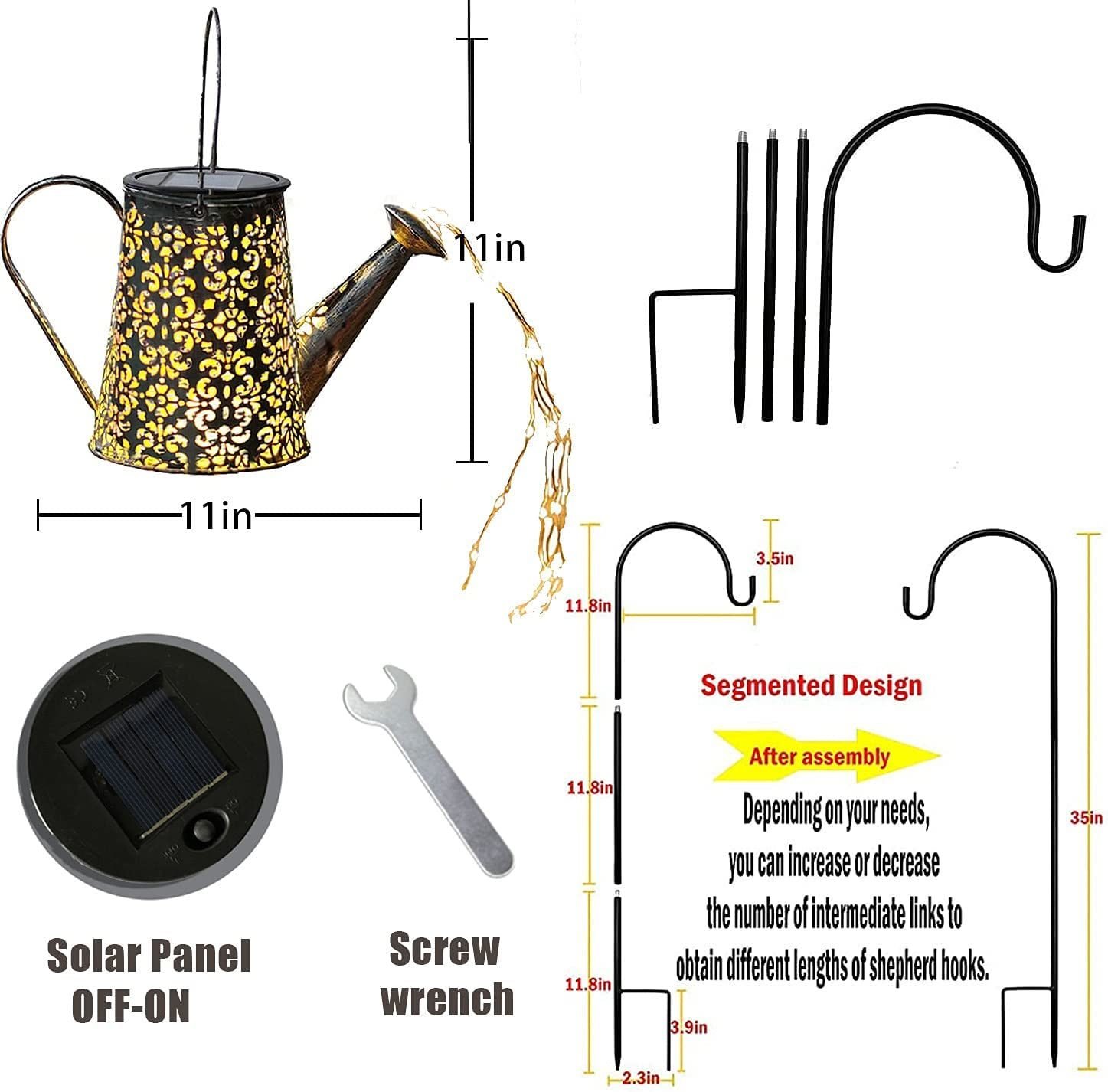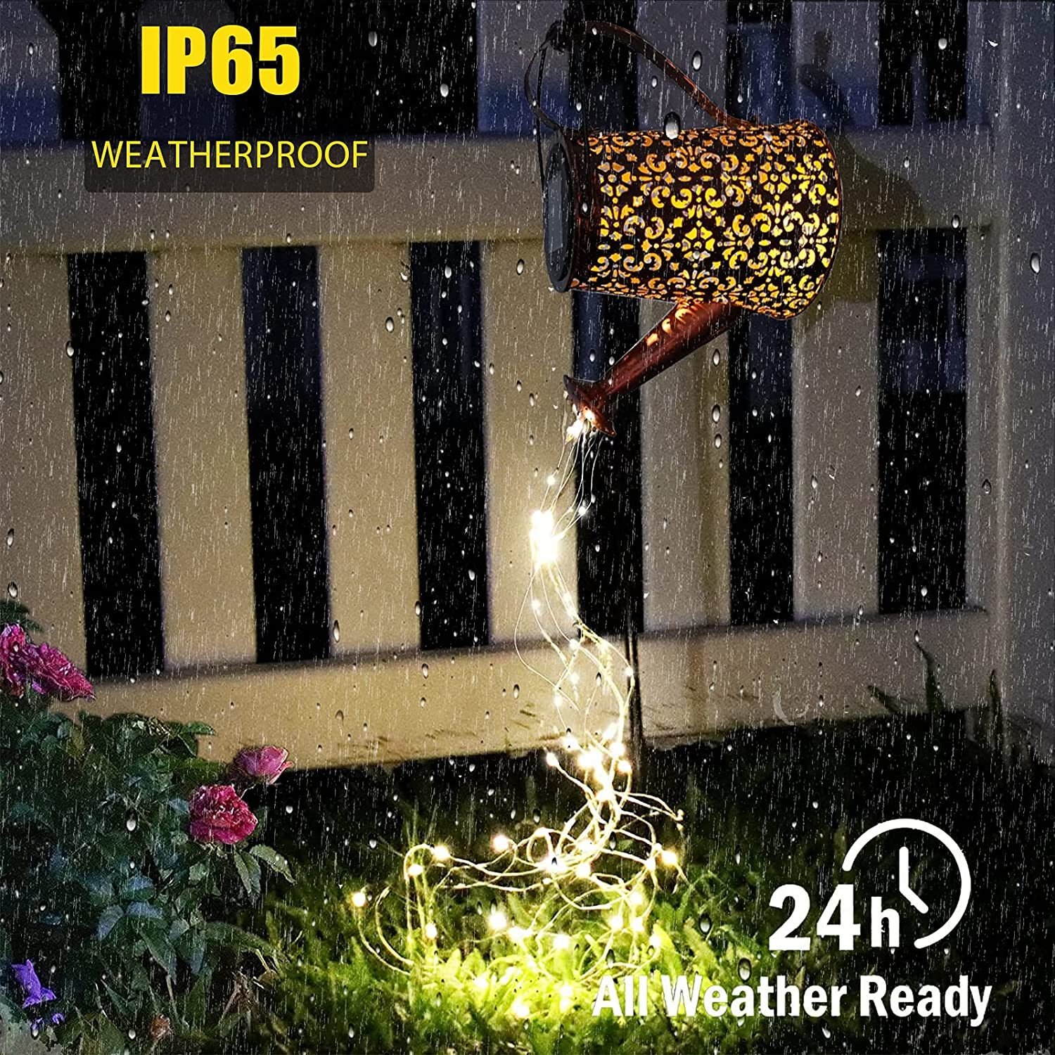 1.Unique LED watering can: This twinkle star shower consists of 8 Copper wire 64 leds (31.5in) and 32inch shepherd hook.The solar garden decoration lights Create a unique focal spot in your after-dark garden by unleashing a cascade of the teeniest lights.