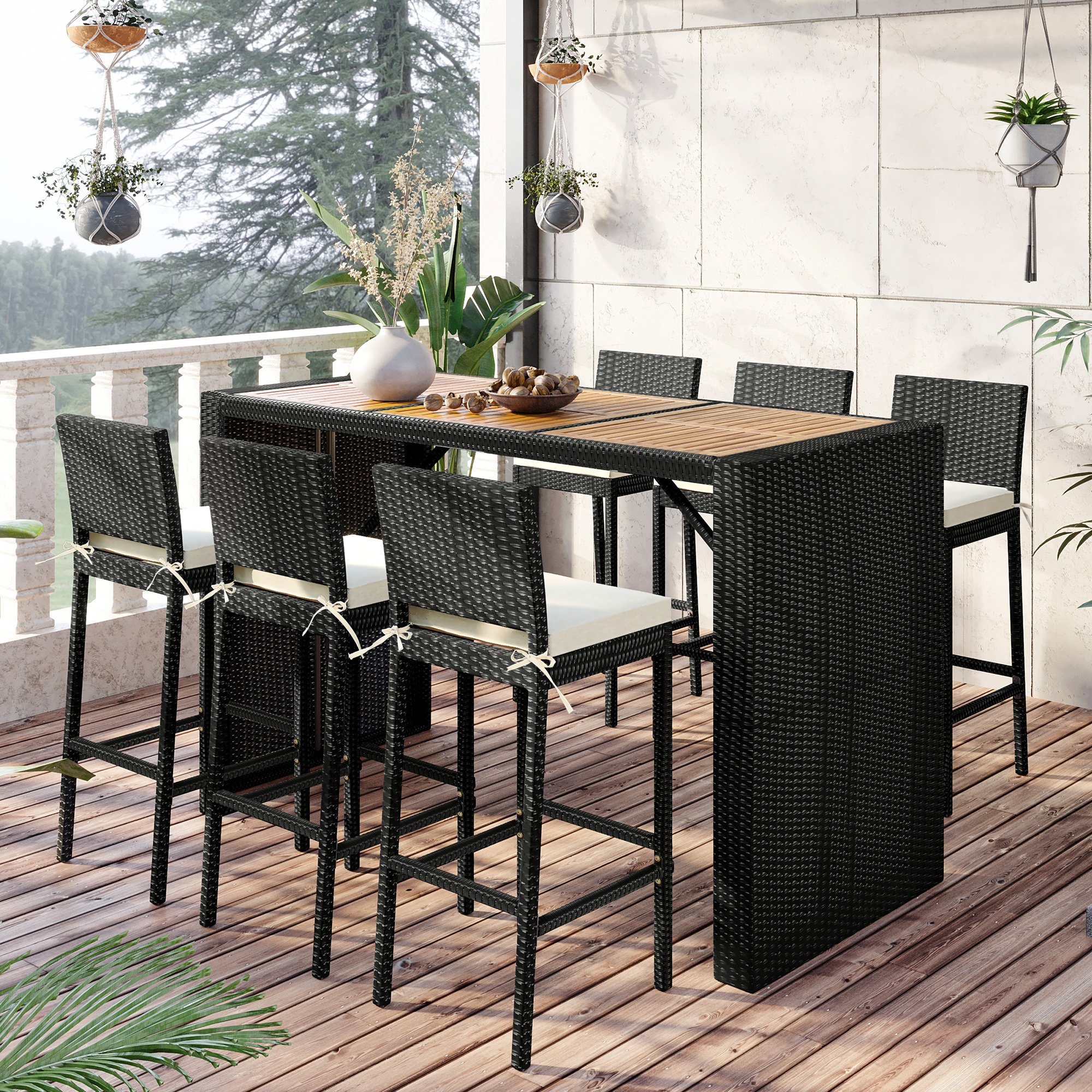 Try some new styles for your dining time. Enjoy your quality time with this outdoor rattan bar table set while having lunch with your family or small talk with your friends in the evening. With 6 bar chairs and 42.5" height bar table, this dining set will be perfect for a big family to dine or relax in the sunshine.