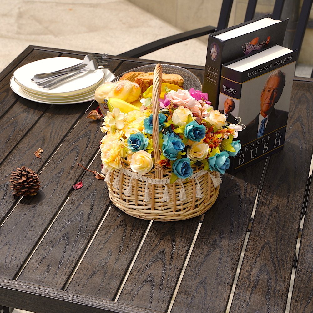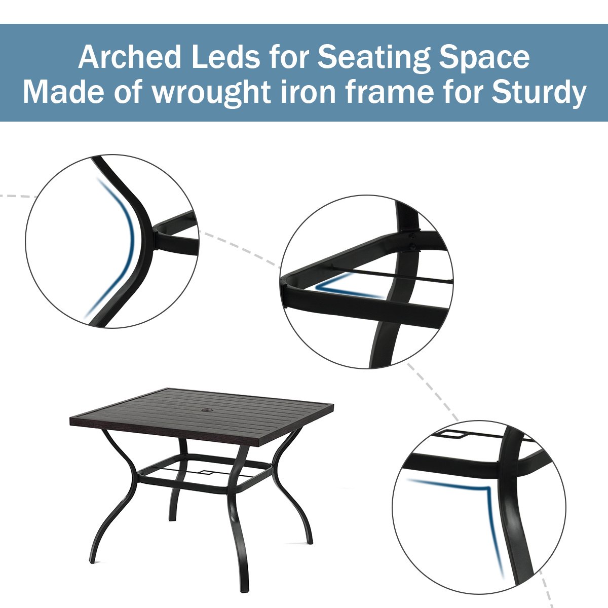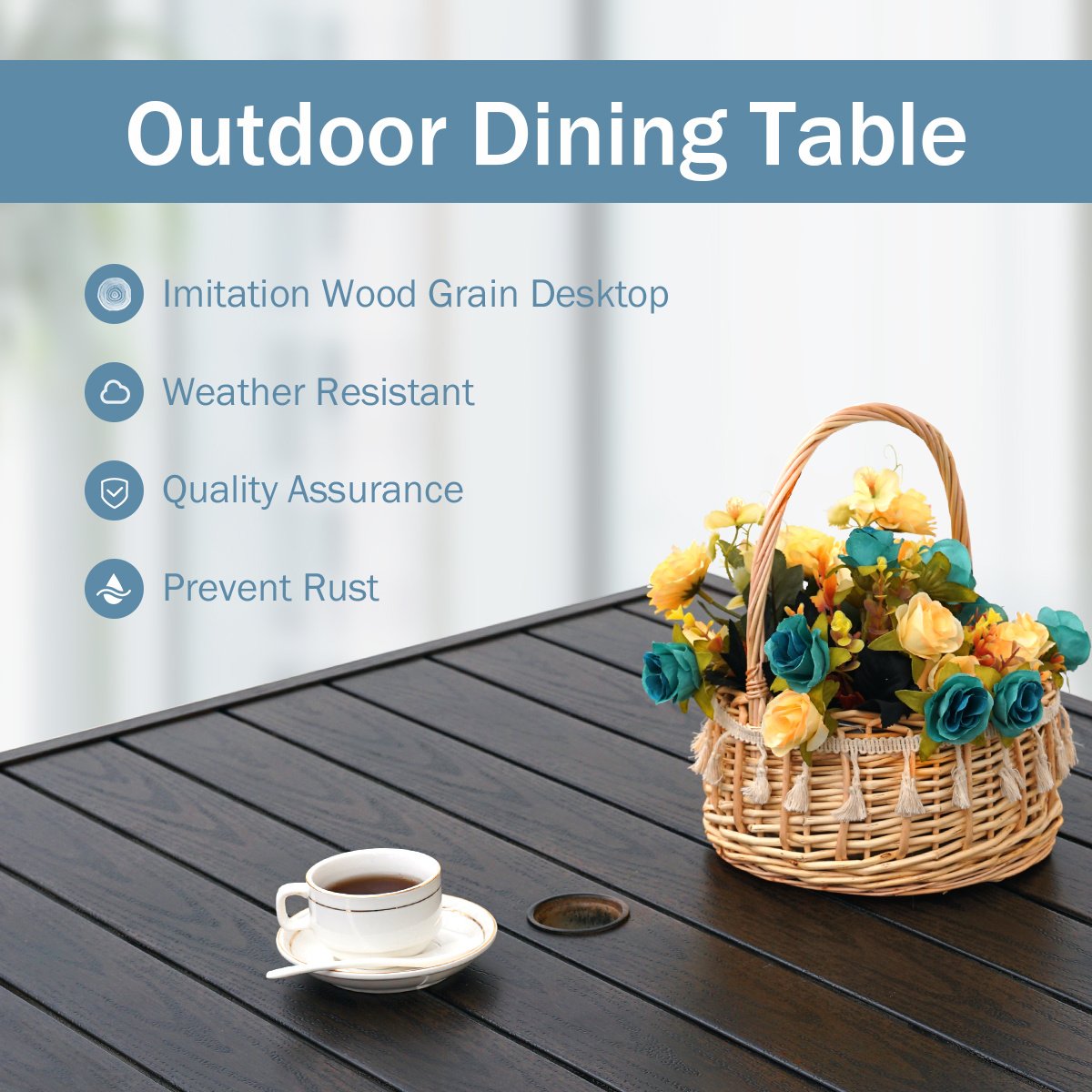 1.Wood-like Patio Table: A stylish wood-like texture metal tabletop with a 1.57" umbrella hole. It will be a eye-catching patio table among all your outdoor furniture. This patio table can be paired with our patio dining chairs. Perfect spot to chat and dine in any dining room, kitchen, breakfast roo