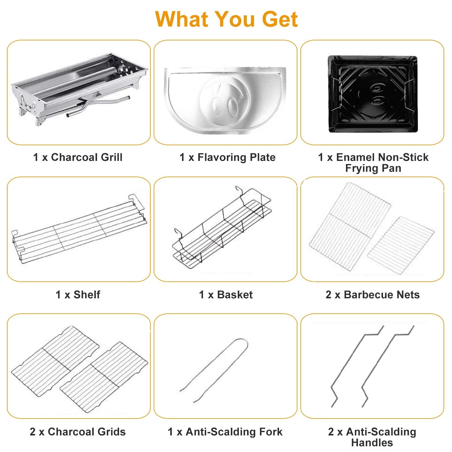 ** Stainless Steel Charcoal Grill*:Both the grill and the barbeque nets are made of premium stainless steel. They are sturdy,load-bearing and easy to clean after use,which makes your cooking more hygienic.