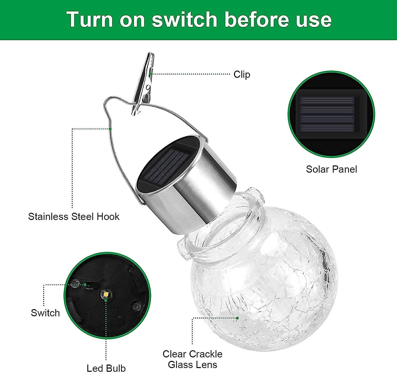 3.Easy Installation: The installation of outdoor hanging solar lights are simple,Just remove the plastic protector, turn switch to ‘ON’ position,then place the solar panel in a sunny location which can receive the maximum amount of sunshine